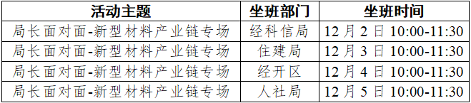 为深入落实市委市政府关于推进重点产业链高质量发展的部署要求,以产业链为导向“面对面听取意见、实打实解决问题”,打造“进解优促”常态化服务企业升级版。将组织开展“每周有链长接待、每天有局长坐班——新型材料产业链专场”活动。